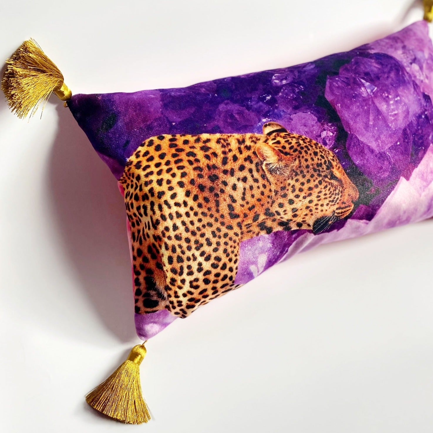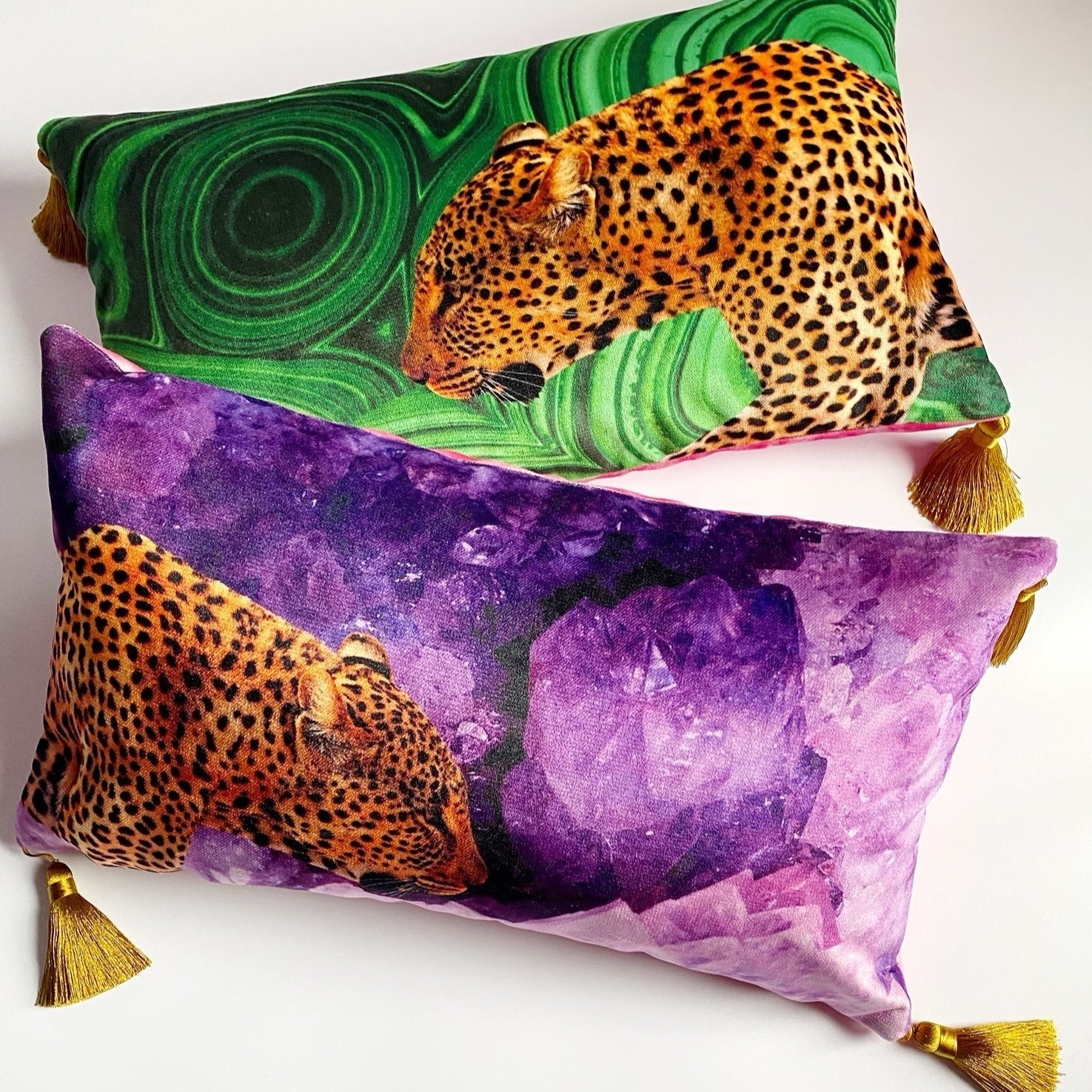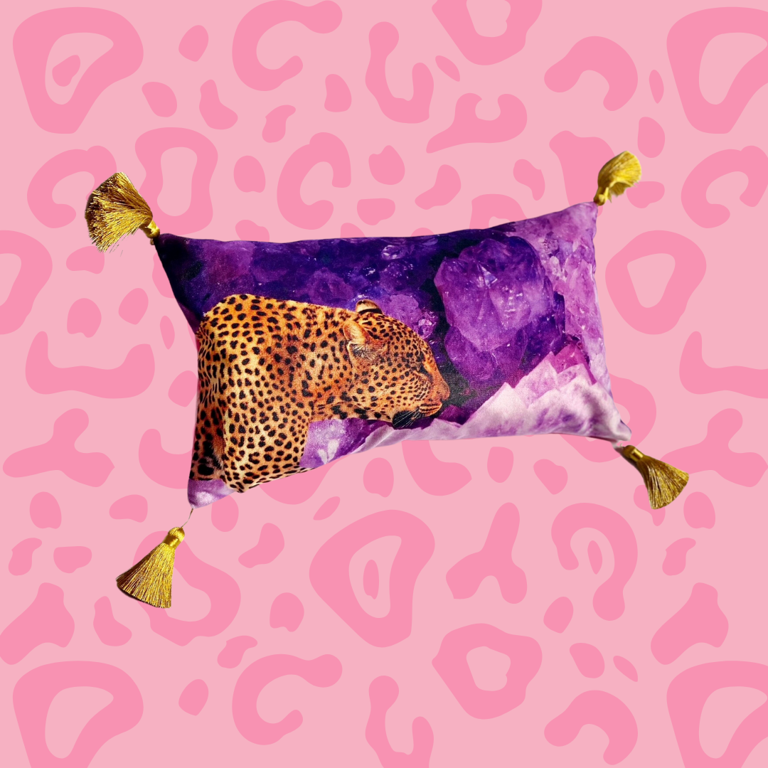 The 'Amethyst Leopard' cushion features a prowling leopard set against a deep purple amethyst stone background on the front and our signature pink leopard print and neon text on the back - you can style our cushions either way to change your look in an instant.
