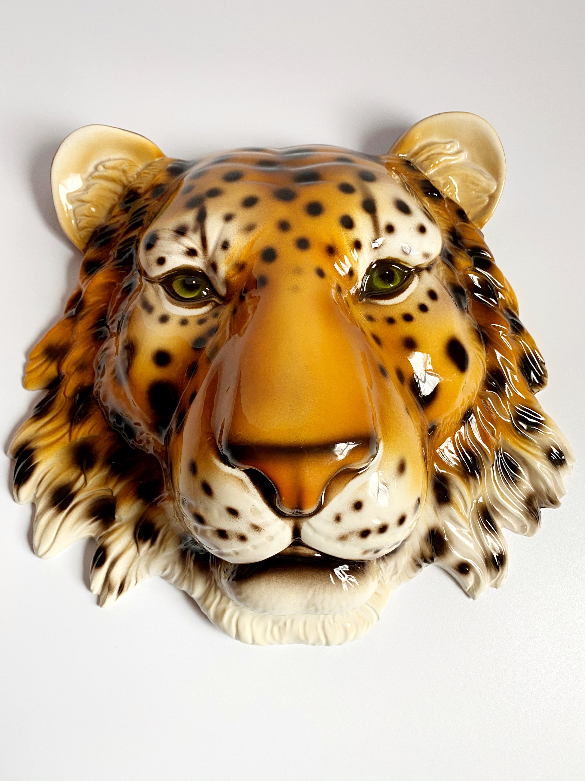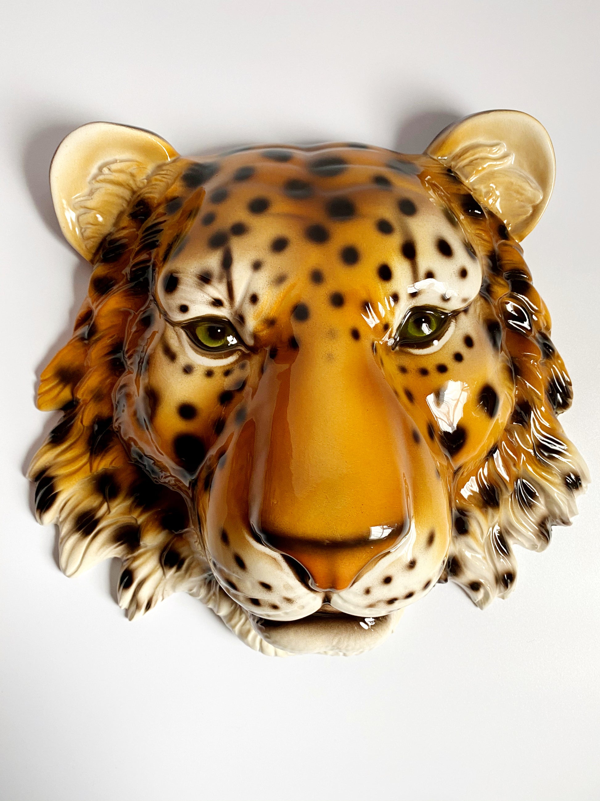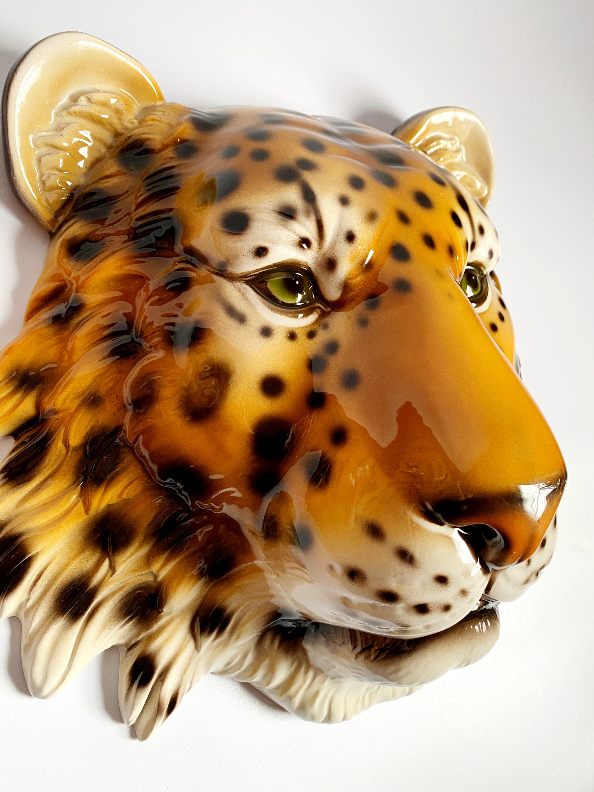 Incredible ceramic leopard face wall plaque, looks wonderful as a statement piece or as part of a gallery wall.