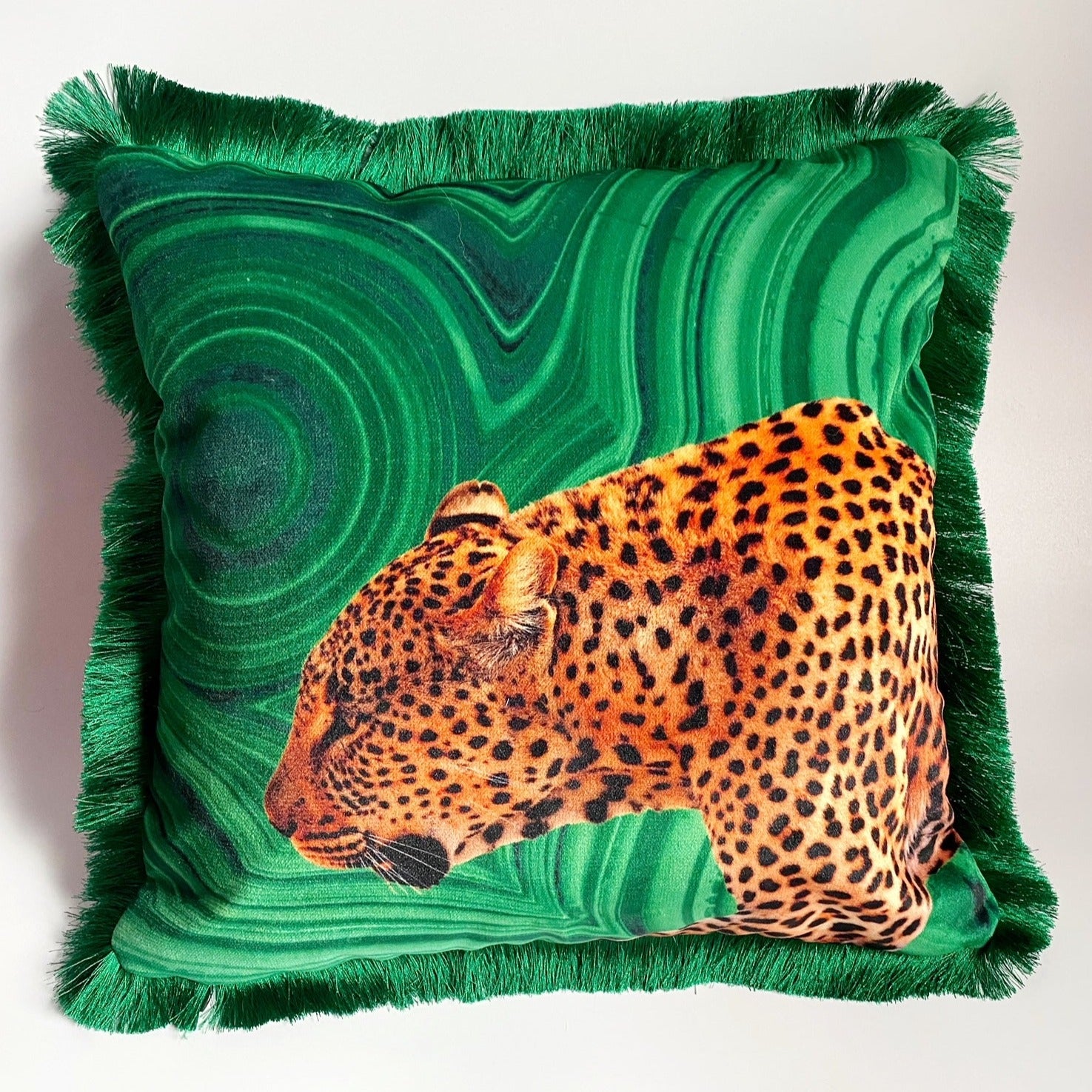 The 'Prowl' cushion features a prowling leopard on a background of green malachite on the front and our signature pink leopard print and neon text on the back - you can style our cushions either way to change your look in an instant.